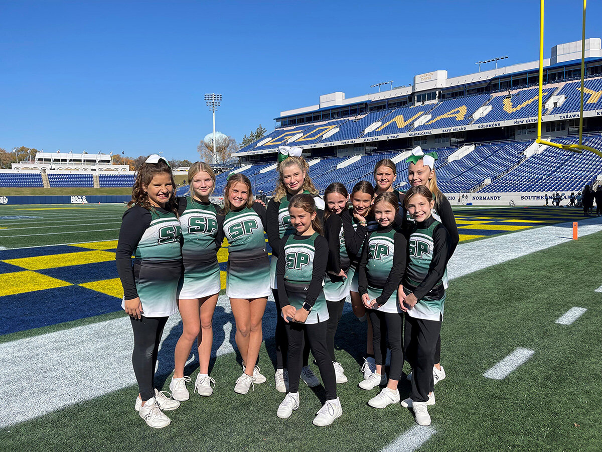 Green Hornets cheerleaders performed at halftime of the Navy versus University of Alabama at Birmingham football game on November 11.