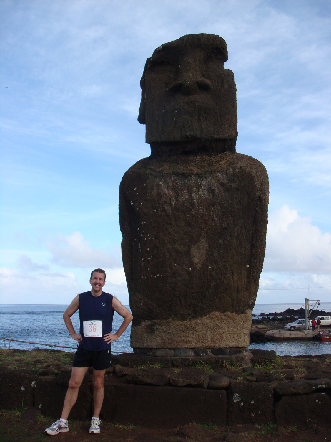 He created fond memories with every race. Because Easter Island is only about 15 miles long at its widest point, Peters’ wife, Kelly O’Toole, followed him on a scooter for part of the run. Along the way, large Moai statues with somber faces and elongated noses greeted the visitors.