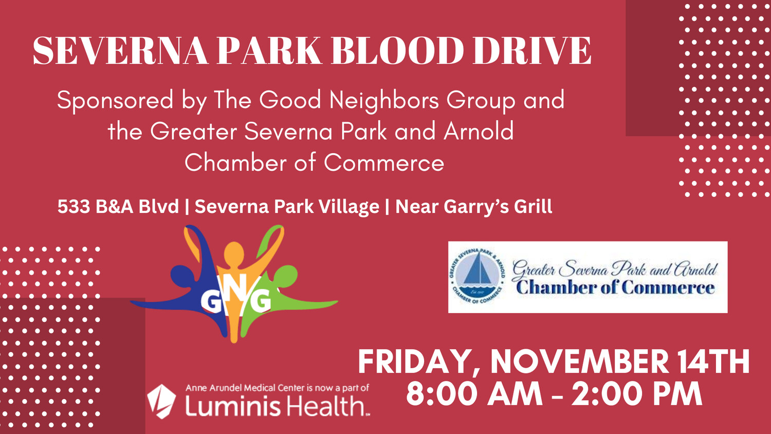 Join the us for the Severna Park Community Blood Drive on Friday, November 14th from 8:00am - 2:00pm.