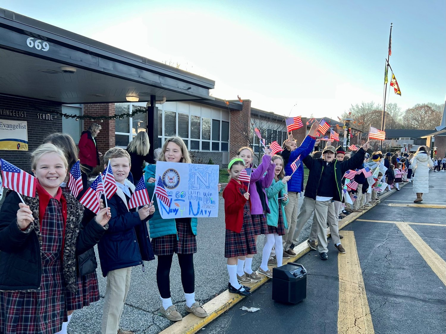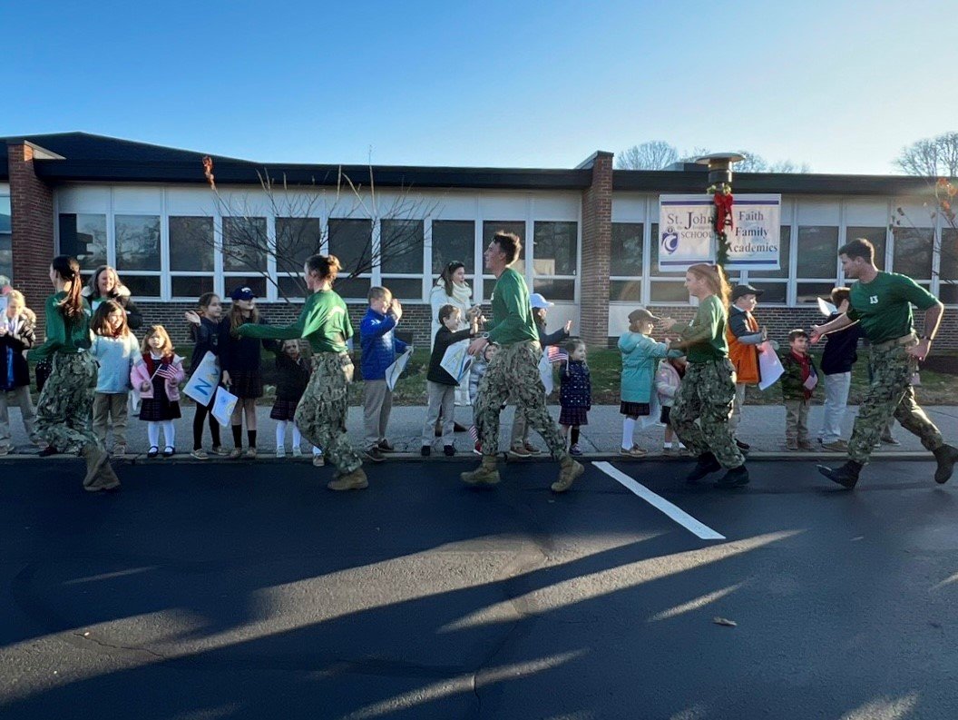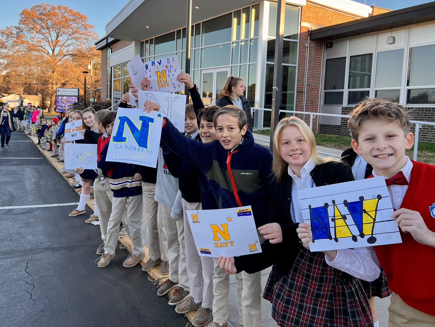 St. John the Evangelist students cheered on midshipmen who passed by the school Friday morning as part of their route to Philadelphia. The Army-Navy game will kick off in Philadelphia on Saturday at 3:00pm.