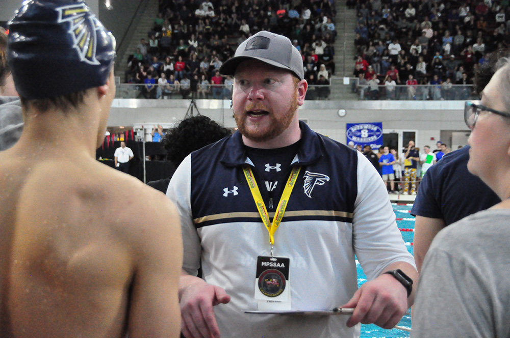 Severna Park High School head swim coach Trevor Brinton chats with a swimmer at the 2023 Maryland Public Secondary Schools Athletic Association Swimming and Diving State Championships last month.