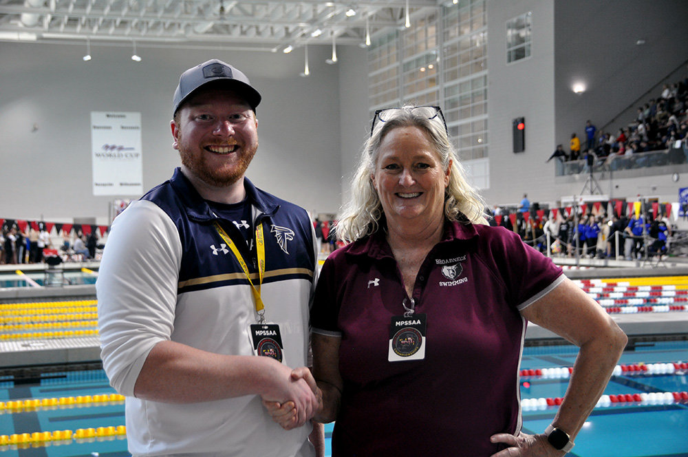 Severna Park High School head swim coach Trevor Brinton congratulated Broadneck High School head swim coach Colleen Parr Winans following the high school state championship meet for swimming and diving.