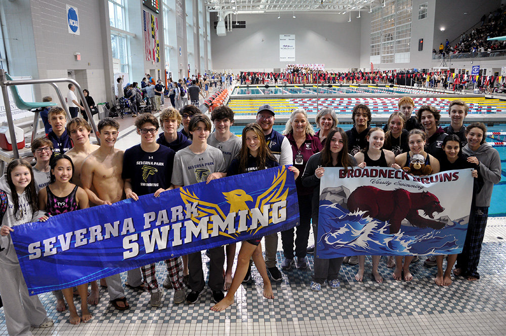 Severna Park and Broadneck’s state championships squads posed following the meet, which was held at the University of Maryland.